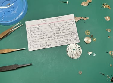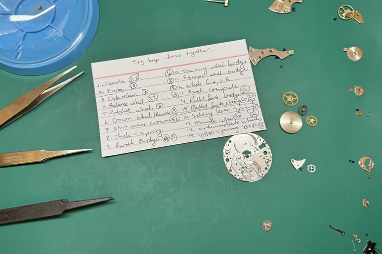 Before even touching a single screw, I did what I believe any beginner hobbyist should do: I watched a full YouTube tutorial on how to disassemble and reassemble the movement I was going to work on. I also took notes, carefully writing down the order in which parts needed to be removed.