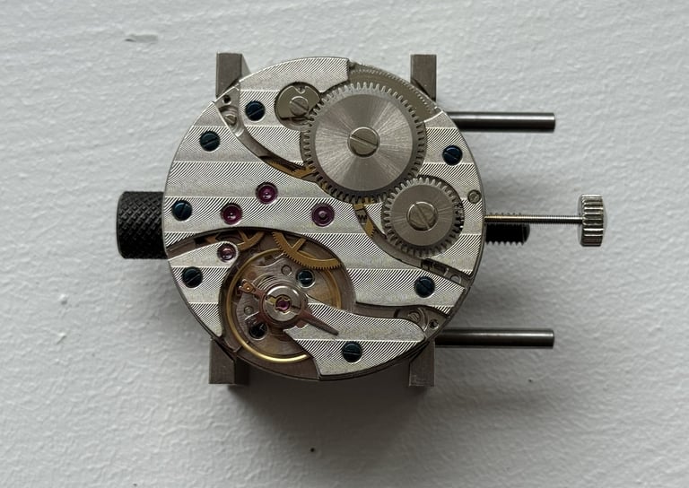 Positioning the movement in the holder is more delicate than it seems. It is very easy to overtighten it. I did, and the movement stopped. I had a brief but very real moment of panic, convinced I had bent the balance before even removing the first screw. Fortunately, loosening the holder solved the issue.